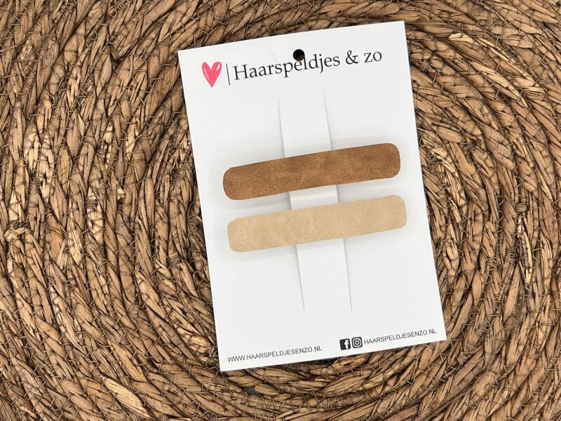 Deze French barrette spelden zijn geschikt voor de wat vollere bossen haar. De spelden zijn 8 cm groot en op de speld zit een stukje imitatieleer bevestigd. Ze worden verkocht in setjes van twee spelden.